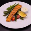370 г • Филе лосося, спаржа, помидоры черри, соус «Блю-чиз»