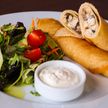 250/30 г • блинчики, куриное филе, грибы шампиньоны, лук, сливки, сметана, микс салатов, помидор черри, красный песто