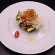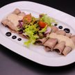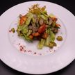 220 г • Язык телячий, огурцы корнишоны, микс салатов, помидор черри, сыр пармезан, орех грецкий, соус «Розе», плоды каперсов