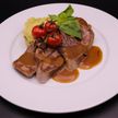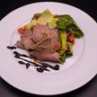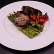 380 г • Вырезка говяжья, грудинка, спаржа, помидоры черри, плоды каперсов, соус «Брусничный»