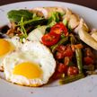 350 г • Яйца, колбаска куриная, грибы шампиньоны, помидор, фасоль стручковая, микс салатов, помидор черри, красный песто, хлеб тостовый